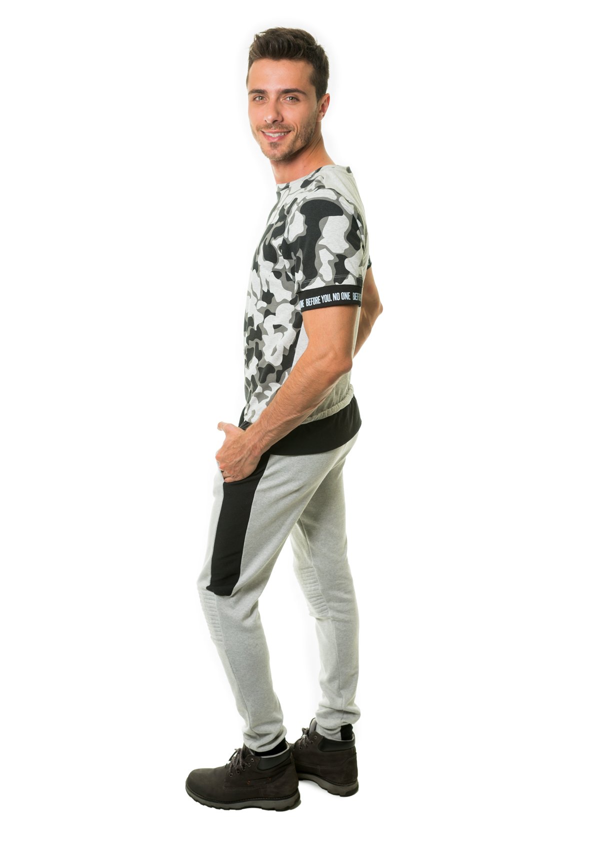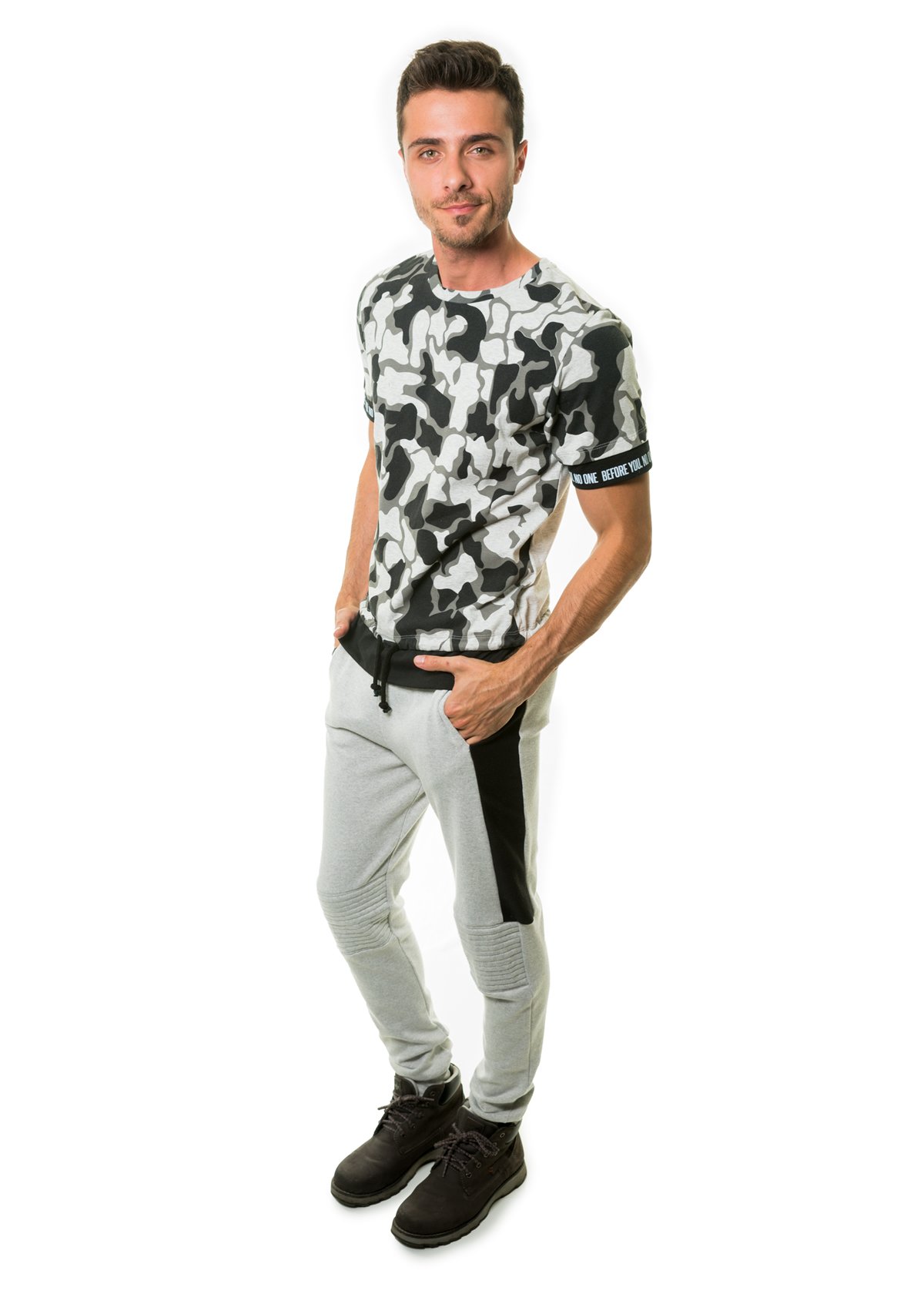 Camisa con estampado tipo militar con detalles en las mangas que armoniza perfectamente con un jogger claro con detalles obcuros y lisos en la parte de los costados que te dara un aspecto muy juvenil y a la moda