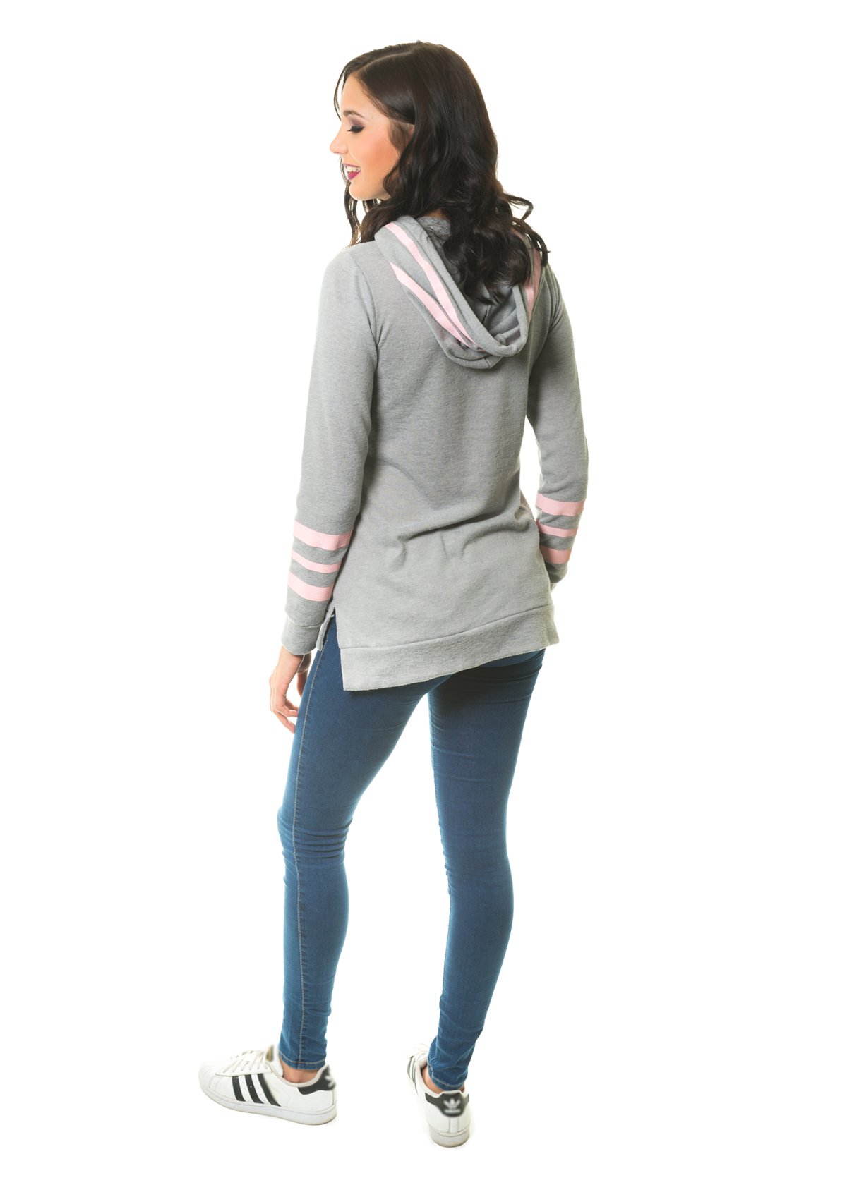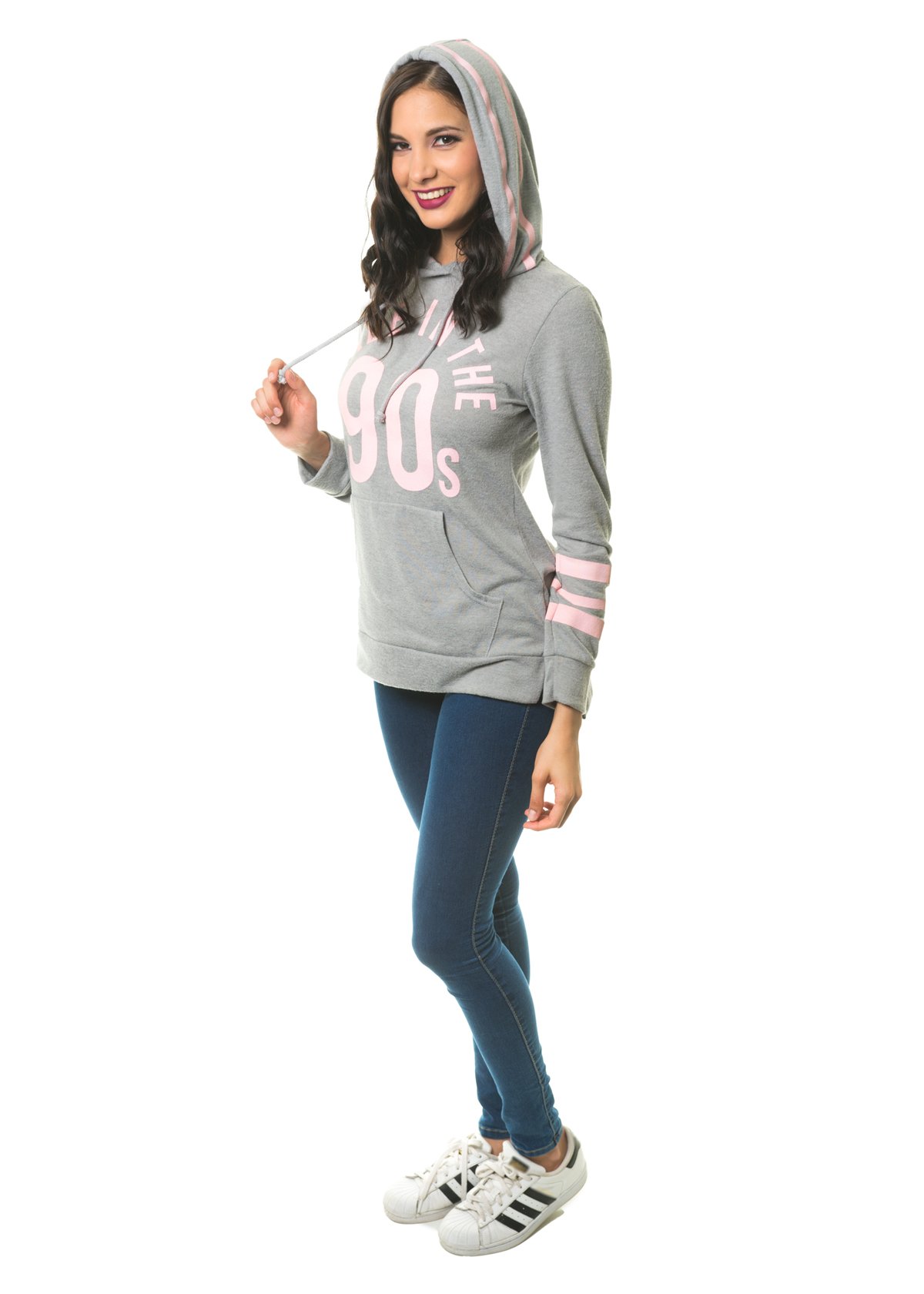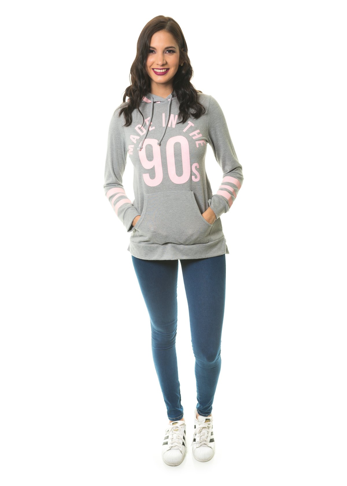 Sudadera amplia y larga con capucha, bolsa canguro, estampado en el medio y detalles en las manga, esta prenda te hará lucir relajada y juvenil, tiene cierto toque sport y los tonos son muy combinables.