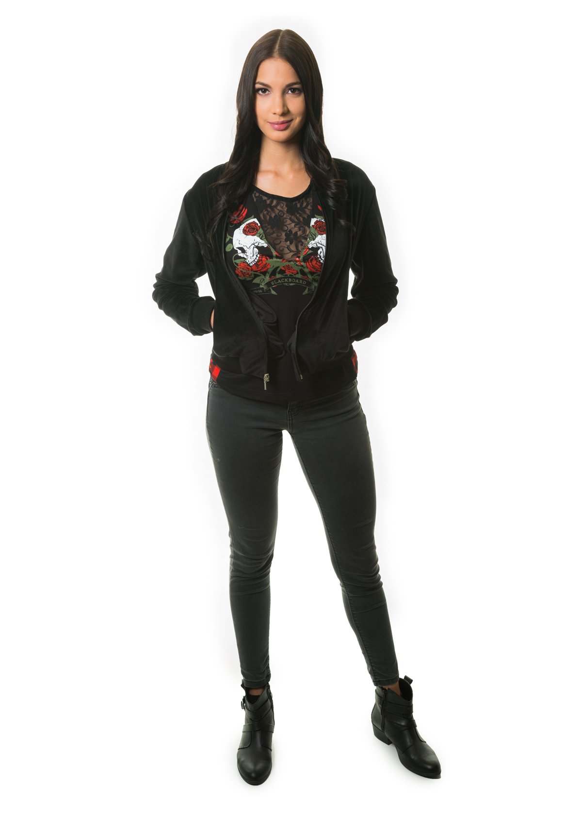 Conjunto de Sudadera con tela tipo velvet, suave y cómoda que armoniza perfectamente con una camisa de encaje negro en la parte del cuello, y estampado de calavera en la parte media de la prenda, te dará un look urbano, juvenil y muy moderno.