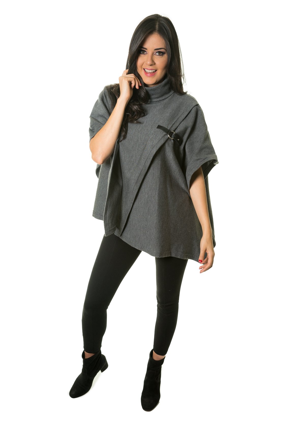 Capa con cuello ligeramente alzado, cruce en medio con detalle en el pecho, esta prenda es perfecta para complementar cualquier atuendo y le dará un toque elegante y clásico, ideal para cualquier ocasión.